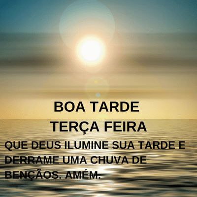 Boa tarde de terça feira para você repleta de otimismo e coisas boas. Quero te desejar uma boa tarde terça feira com uma chuva de bençãos, pois Deus quer te abençoar com uma boa tarde terça feira abençoada você e sua familia. E te convido para compartilhar com eles uma bela mensagem de boa tarde de terça-feira cheia de carinho. Seja feliz e tenha uma linda tarde.