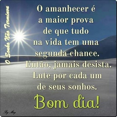 bom dia-mais um dia começando. Mais um amanhecer fresquinho e gostoso com o sol aparecendo e você acordando para levantar, tomar seu café e ir para suas lutas do dia-a-dia vencer, seja nos estudos ou no trabalho. Que seu dia seja lindo, que seu sorriso motive aqueles que estão ao seu redor deixando eles alegres e também entusiasmados. Deseje sempre um bom dia para pessoas próximas, pois estas simples palavras podem deixar o dia delas muito mais feliz. Pense nisso de agora em diante e nunca desista de seus sonhos pois eles estão logo ali, basta acreditar e persistir.