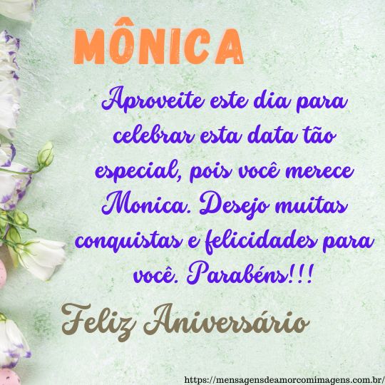 Parabéns e feliz aniversário Monica! Hoje é um dia muito especial, pois é o dia do seu aniversario. Parabéns Monica, com muita paz, saúde e felicidades. Que esta mensagem de feliz aniversário leve para você Monica, uma palavra otimista e cheia de carinho, pois você merece tudo de bom Monica.