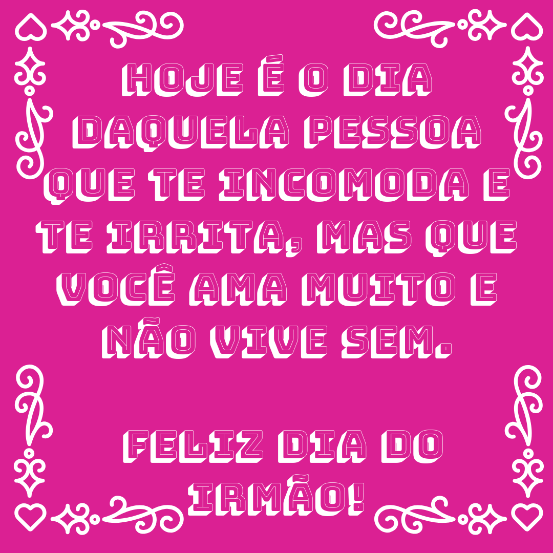 feliz dia dos irmaos para voce com todo carinho e muita felicidade. Hoje é um dia especial, é o dia dos irmãos. E quero te homenagear e dizer o quanto você é importante para mim. Você me faz sorrir e me ensina como é ser uma pessoa batalhadora. Você é muito especial para mim.