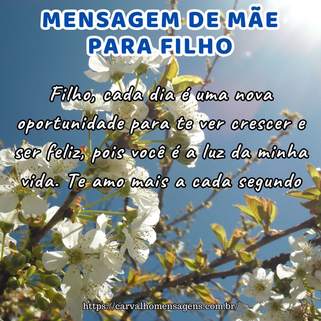 Filho querido, a vida é cheia de desafios, mas você nunca estará sozinho, pois meu amor te acompanha a cada passo. Eu estarei sempre aqui para te apoiar.