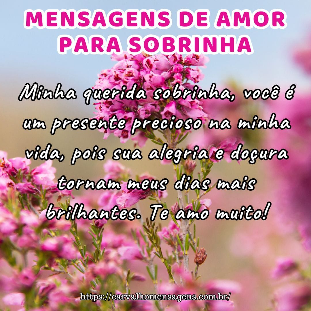 Sobrinha querida, que sua vida seja sempre cheia de bênçãos, pois você é um verdadeiro tesouro. Te amo imensamente e sempre estarei aqui para você.