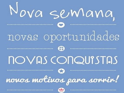 tenha uma semana abençoada e maravilhosa. Nesta nova semana que está começando, seja otimista e acredite em seu potencial, pois novas portas abrirão para você com grandes oportunidades.